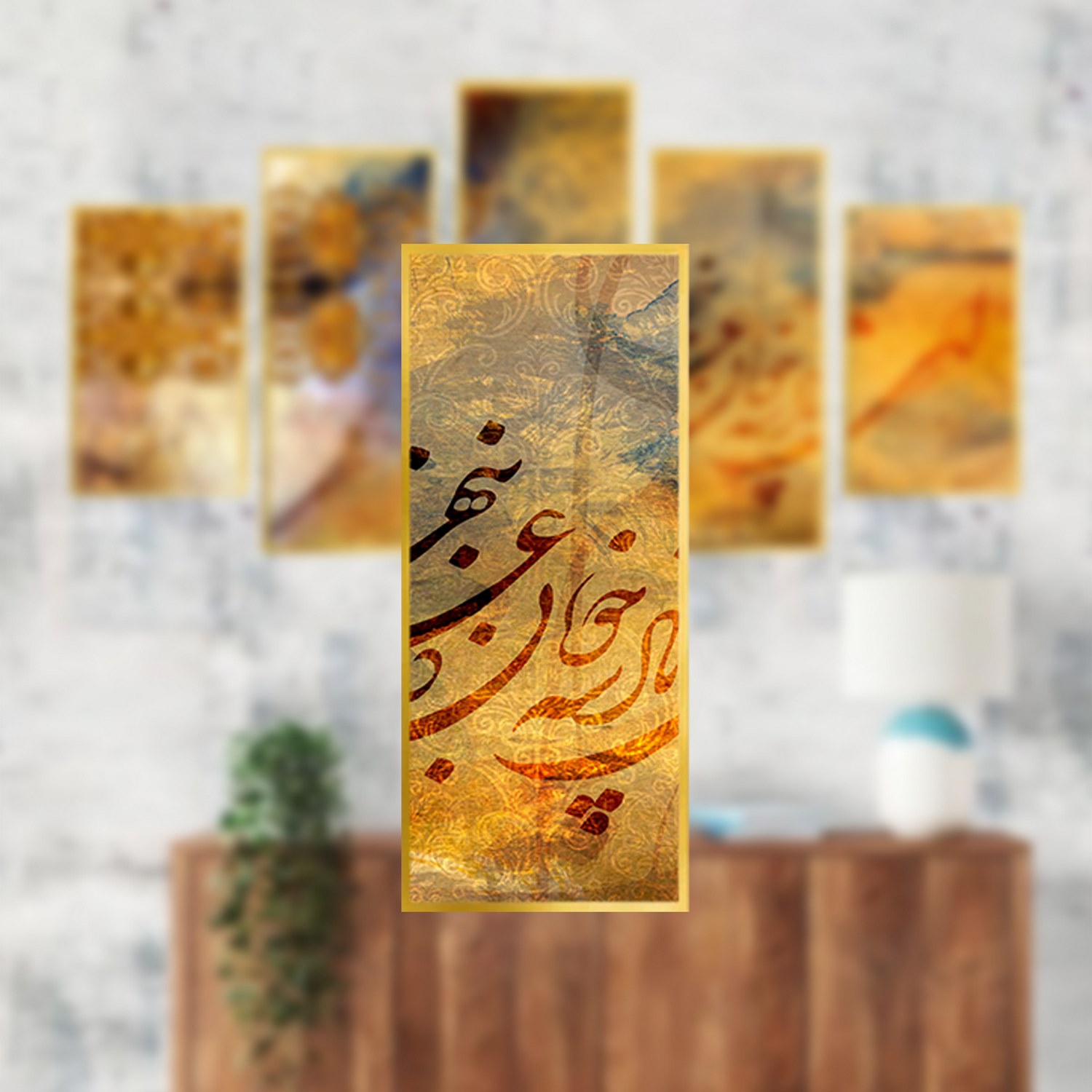 تابلو دکوراتیو چندتکه با طرح خطاطی و خوشنویسی به همراه فریم PVC و شیشه سبک 2 میلیمتری .چاپ عکس این تابلو لمینت شده و ماندگاری رنگ آن بالا و مقاوم در برابر رطوبت می باشد.