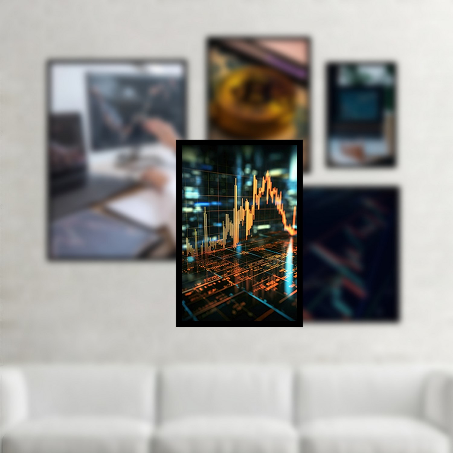 اگر به دنبال یک مجموعه تابلو چند تکه با طرح مدرن و زیبا می باشید پیشنهاد ما تابلو دکوراتیو چندتکه با طرح بارز ارز دیجیتال و بورس به همراه فریم PVC و شیشه سبک 2 میلیمتری می باشد.چاپ عکس این تابلو لمینت شده و ماندگاری رنگ آن بالا و مقاوم در برابر رطوبت می باشد. با این طرح شما میتوانید دکوری زیبا را با هزینه بسیار کم برای منزل یا محل کار خود به ارمغان بیاورید