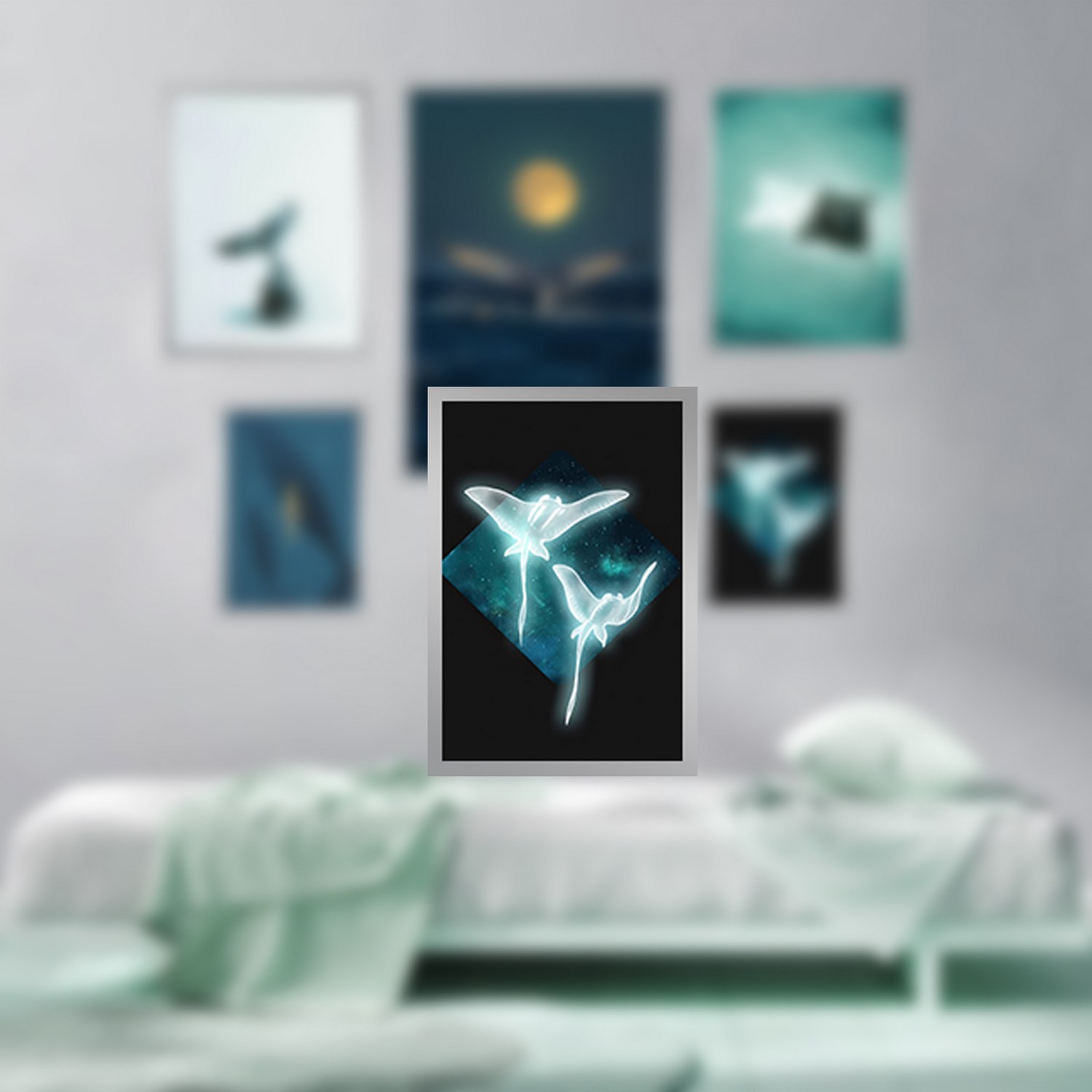 تابلو دکوراتیو چندتکه با طرح طبیعت دریا و دلفین به همراه فریم PVC و شیشه سبک 2 میلیمتری .چاپ عکس این تابلو لمینت شده و ماندگاری رنگ آن بالا و مقاوم در برابر رطوبت می باشد.