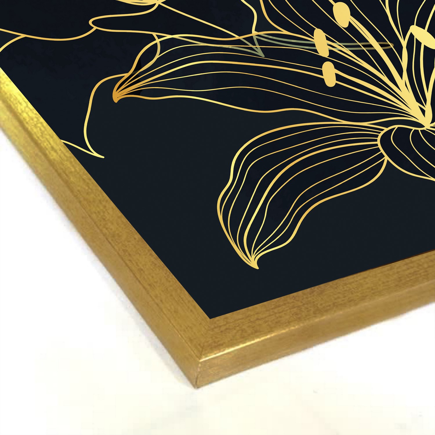 تابلو دکوراتیو چندتکه با طرح نقاشی گل طلایی به همراه فریم PVC و شیشه سبک 2 میلیمتری .چاپ عکس این تابلو لمینت شده و ماندگاری رنگ آن بالا و مقاوم در برابر رطوبت می باشد.